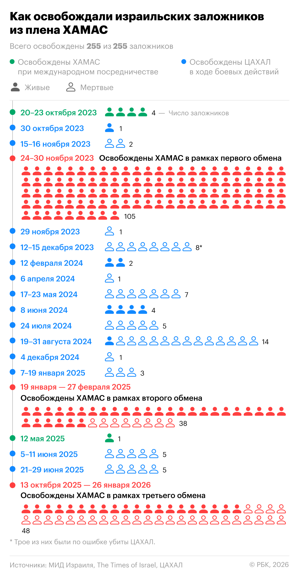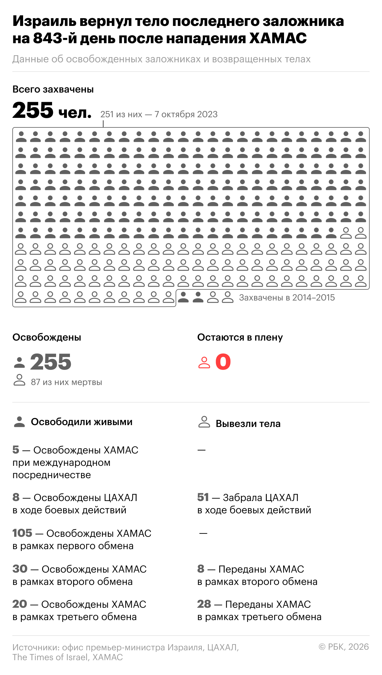 ЦАХАЛ сообщила, что вернула на родину тело последнего заложника, остававшегося в секторе Газа, — 24-летнего сержанта Рана Гвили, его личность удалось подтвердить. Как освобождали остальных заложников — в инфографике РБК