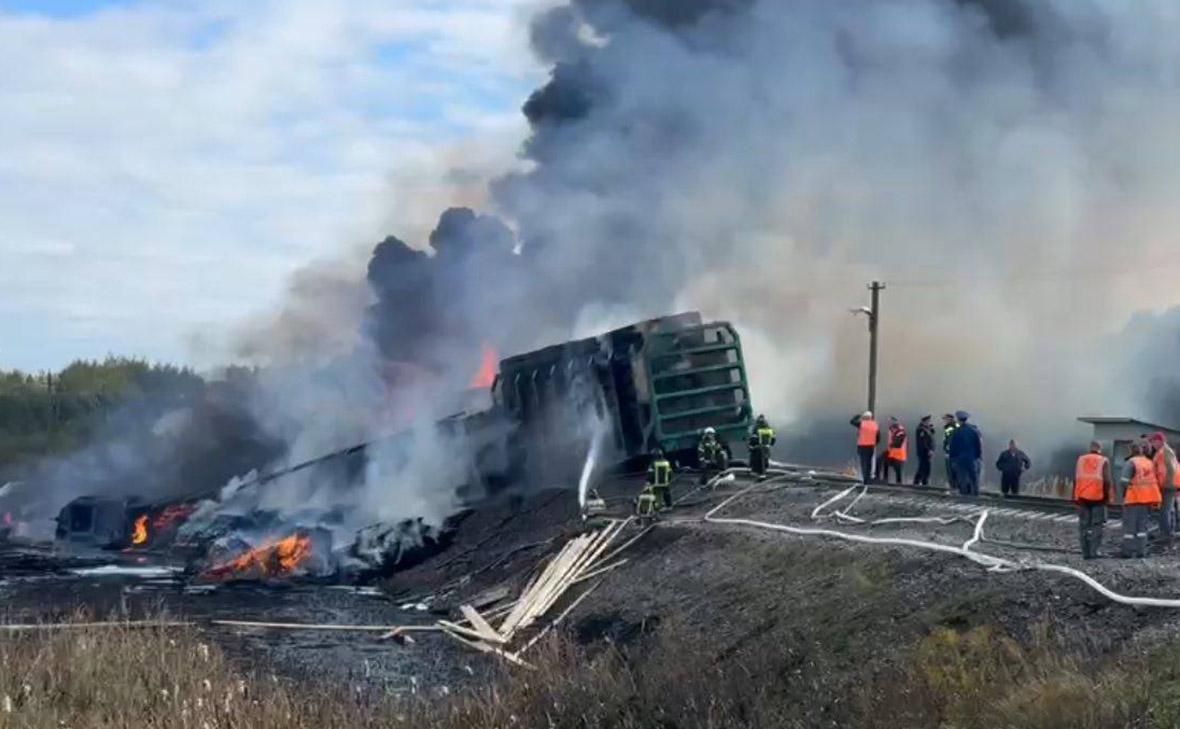 В результате рельсов сошли 18 вагонов с бензином, 16 из них опрокинулись и загорелись. Огонь распространился на площади 400 кв. м. Пострадали двое сотрудников локомотивной бригады — машинист и его помощник. Водитель фуры, по данным СК на транспорте, погиб.