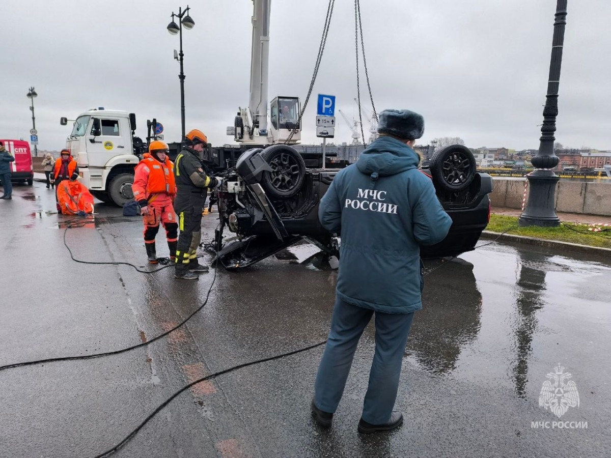 К операции на месте происшествия были привлечены водолазы Поисково-спасательной службы Санкт-Петербурга: они обнаружили автомобиль на дне реки и подняли его на поверхность с помощью автокрана.