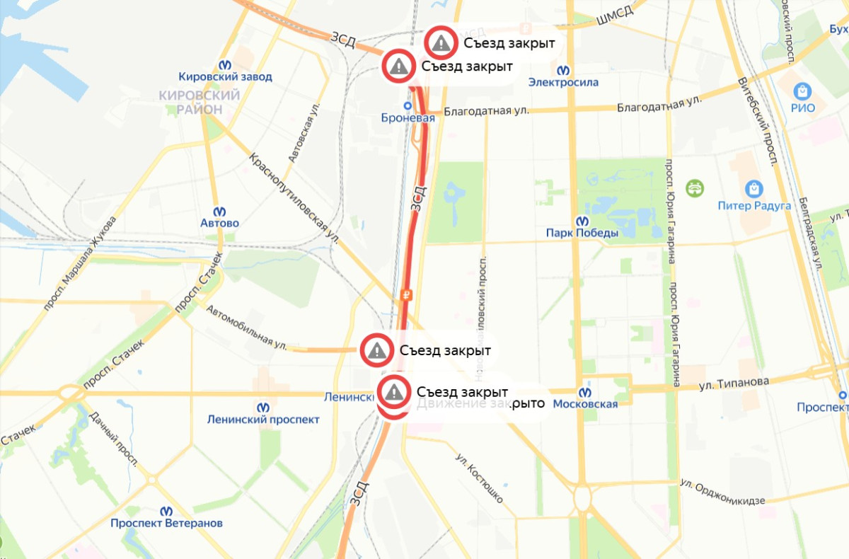 Самые масштабные ограничения введут в ночь с 23 на 24 февраля и с 24 на 25 февраля — с 23:00 до 06:00 движение закроют сразу на нескольких участках. В это время нельзя будет проехать по основному ходу ЗСД в районе съезда на Автомобильную ул., а также воспользоваться съездами с Ленинского проспекта и Автомобильной ул. в сторону Благодатной ул. На это же время закроют съезд с ЗСД на ШМСД в направлении Витебского проспекта.