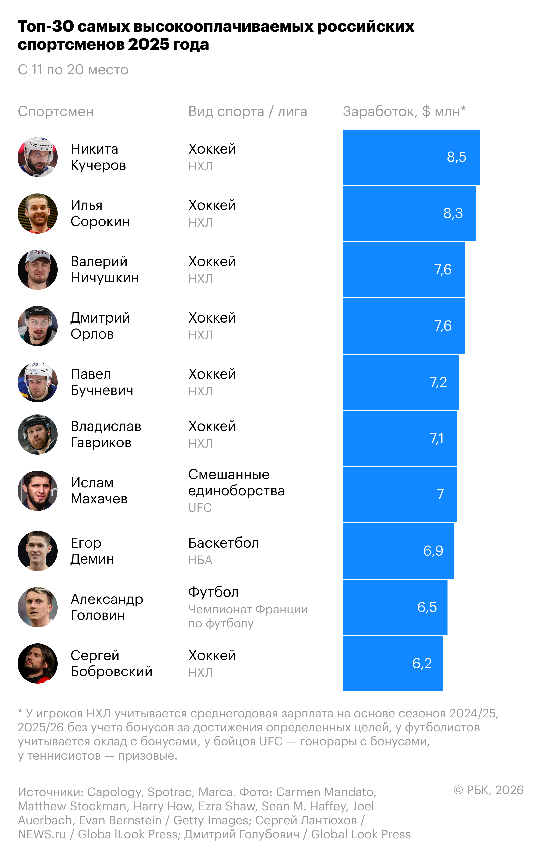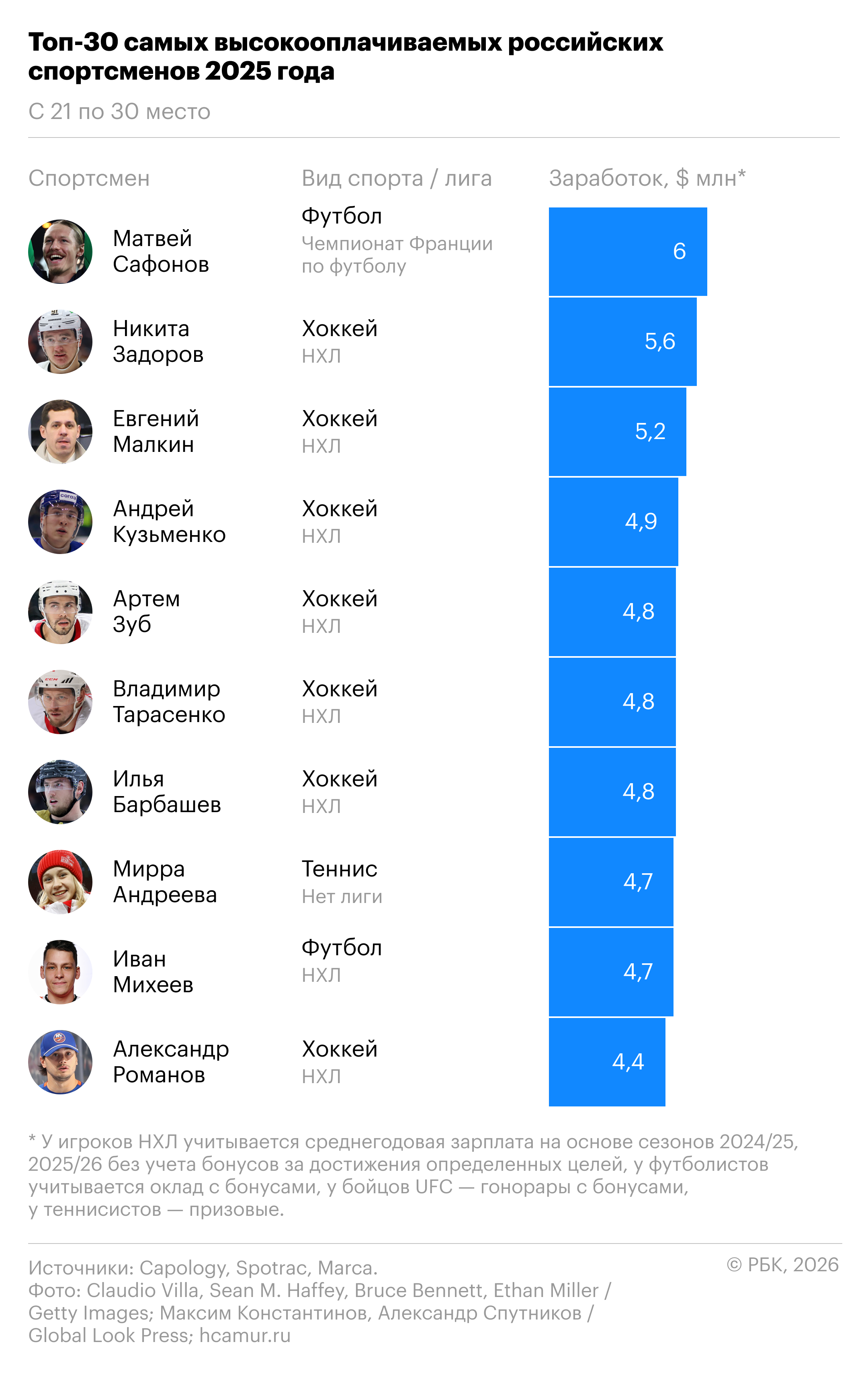 Для хоккеистов НХЛ учитывалась среднегодовая зарплата за два предстоящих сезона (2024/25 и 2025/26), исключая бонусы за достижения определенных целей. В расчет заработка футболистов и бойцов UFC включены бонусы, тогда как доход теннисистов определяется только на основе выигранных призовых.
