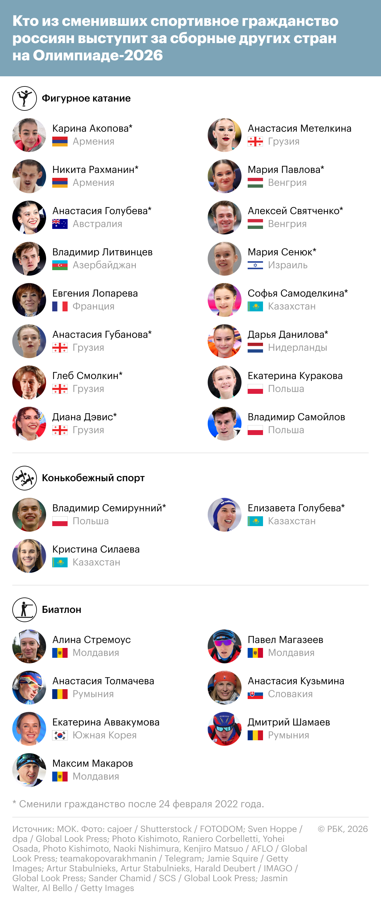Всего на Олимпиаде за другие сборные выступят 26 сменивших спортивное гражданство россиян. Наибольшее число в фигурном катании — 16.