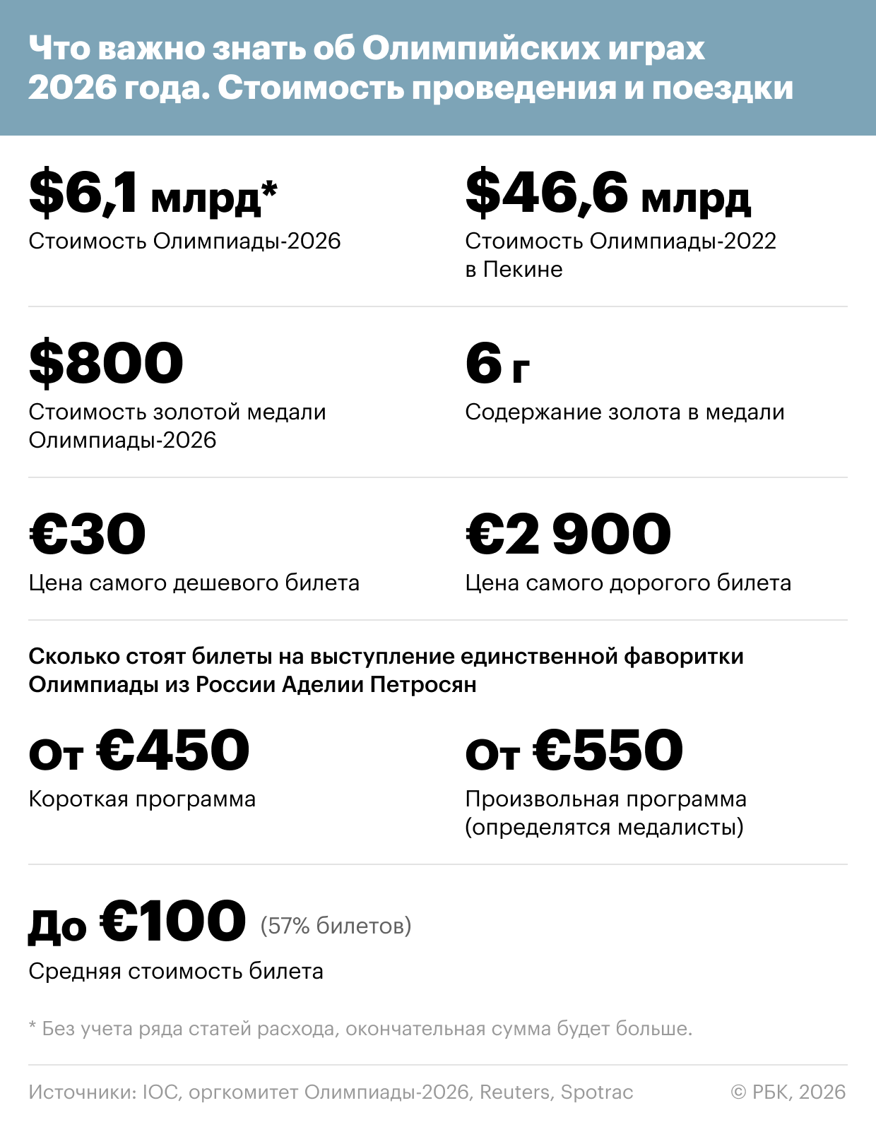 Общие траты на данный момент составляют $6,1 млрд, включая $4,1 млрд государственных средств на инфраструктуру и $2 млрд частных средств на организацию и проведение Игр, сообщает Reuters. При этом лишь 15% бюджета ушло на проекты, непосредственно связанные с соревнованиями и спортивными мероприятиями. Для сравнения: на организацию Олимпиады-2022 в Пекине было потрачено $46,6 млрд.
