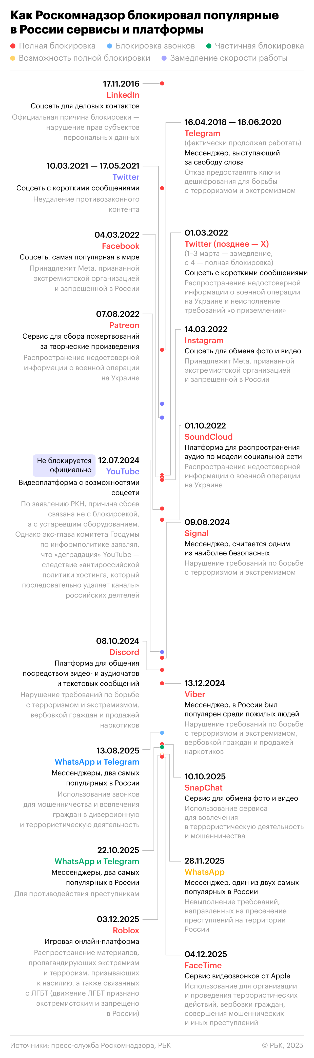 Роскомнадзор в начале декабря сообщил о блокировке сервиса видеозвонков FaceTime и игровой платформы Roblox. Когда и по какой причине до этого блокировали или «замедляли» популярные в России сервисы и платформы — на таймлайне РБК