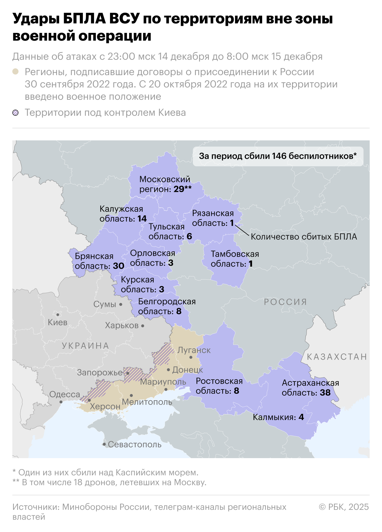 Минобороны сообщило, что с 23.00 мск 14 декабря до 8.00 мск 15 декабря дежурными средствами ПВО перехвачены и уничтожены 146 украинских беспилотных летательных аппаратов самолетного типа: